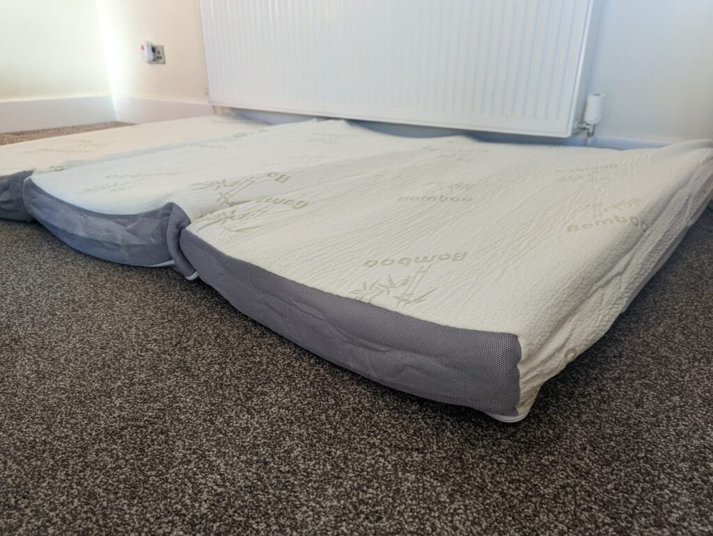 Initial impressions were not great. The Amazon photos show a nice, perfectly formed mattress when folded out, whereas, in reality, it appeared like three memory foam sections loosely joined together with a mattress cover.