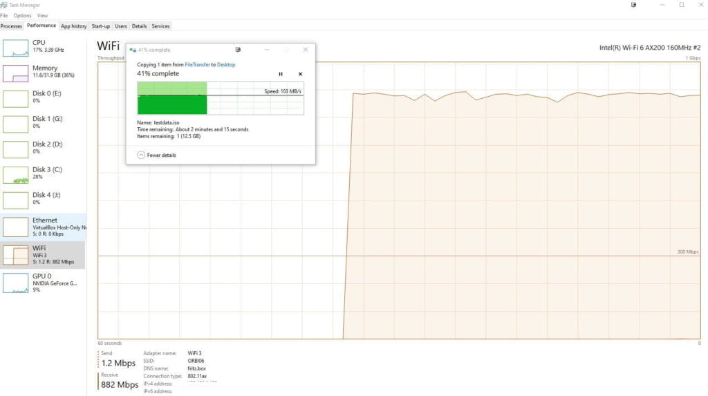 With the connection limited to 1.2 Gbps, transfer speeds feel in line with other Wi-Fi 6 devices connecting at this speed. That is just below gigabit with file transfer speeds over just over 100MB/s and Wi-Fi throughput measured as around 850mbps consistently for most large files transfer.