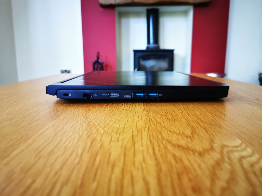 There are plenty of ports included, and this thankfully includes a gigabit ethernet port. Due to the slim nature of the laptop, it expands open. There are plenty of other connections too, including 1x USB 2.0, 2x USB 3.1, 1x USB 3.1 Type-C and then you also get an HDMI 2.0 port out. So you should be able to set this up in a dual monitor desktop environment without buying more cables and adaptors.