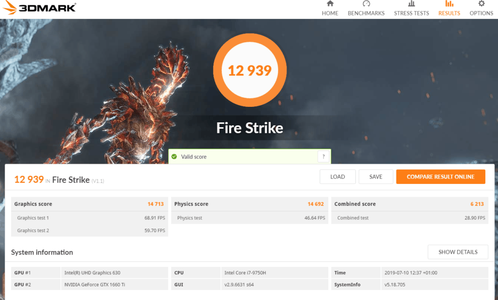 - 3DMark 13 – Fire Strike: 12939 (Graphics – 14713, Physics – 14692);