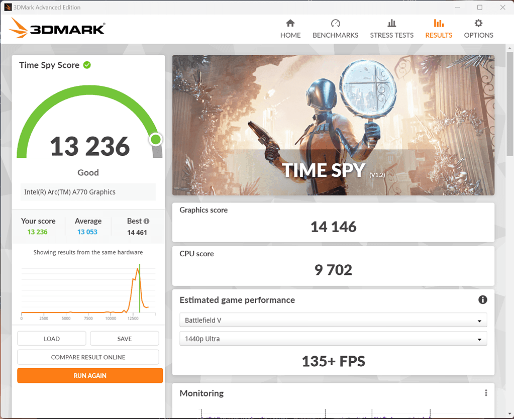 For the GPU comparison, I have taken the average score from the 3DMark database for test results with the same CPU as mine. It is not an ideal comparison, but it shows that the Intel Arc A770 is quite competitive with the other two GPUs.