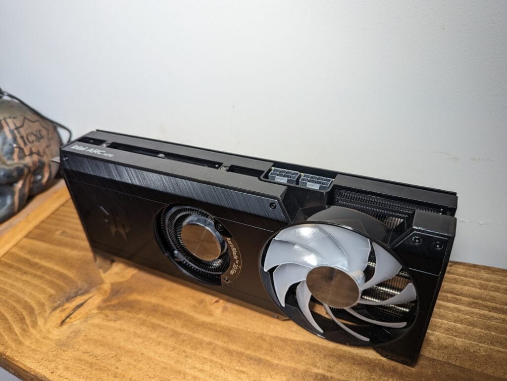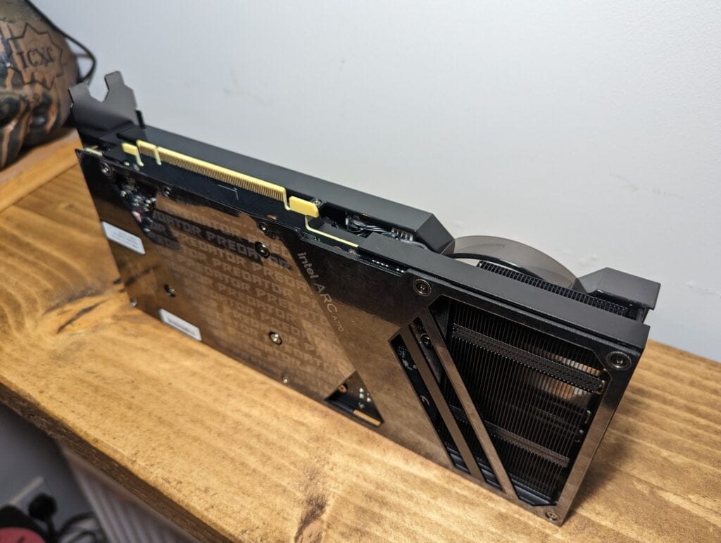 For power, this has 2 x 8-Pin connectors and the TDP is rated at 225W with a recommended PSU of 650W. The reference Intel Arc A770 only requires a 1x 8-pin and 1x 6-pin connector.