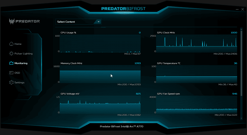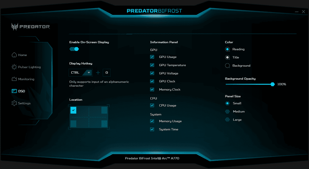 Under monitoring, you get all the stats you would expect, and the OSD option will allow you to display the current usage on screen. You can only position it in the corners of the active display, but it is useful to have when testing.
