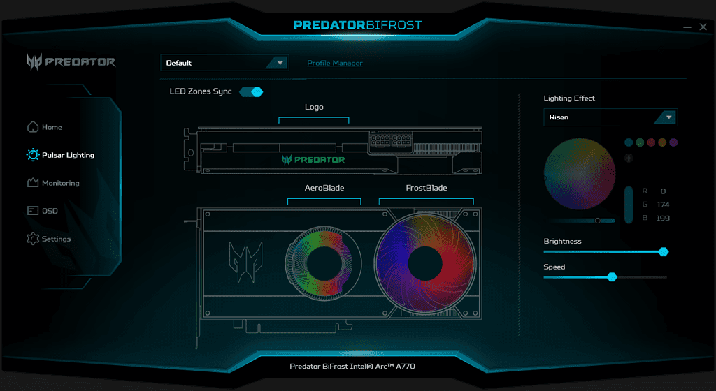 Both fans and the logo on the top of the card have RGB that can be customised via the Acer Predator Bitfrost application. These can all be synced, or you can manually assign lighting effects or a static colour to each element.