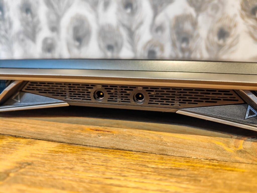 With dimensions of 400 x 319.2 x 35.30 mm, this is one of the largest 17″ laptops on the market. Being both wider and deeper than the Gigabyte AORUS 17X, and bigger in every dimension compared to the Dell Alienware X17. While that may not sound too appealing, the benefit appears to be cooling. The laptop has big inlet fans on the base, which then expel the air on the rear and side vents. While I’d normally prefer smaller, lighter laptops, the overall dimensions and weight become somewhat redundant once you get to this style and size as you will rarely be moving it much.
