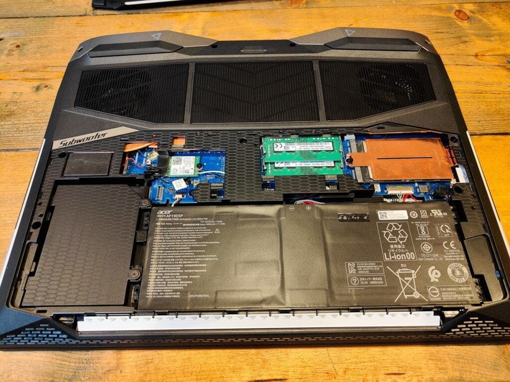 The smaller part provides access to the 2.5″ tray, battery, WiFi module, RAM and M.2 NVMe drives.