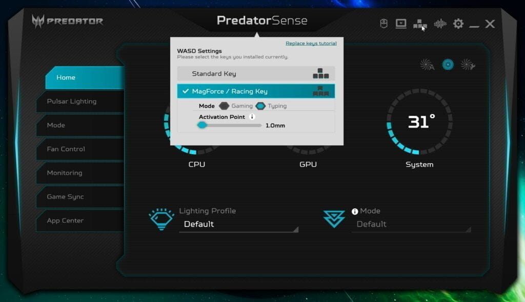 It is also possible to replace the WASD keys with two sets are included in the box. Using the alternative keys, you can set up Predator Sense to provide some analogue control to your keys, with a light press providing a different functionality than a full press. You need to manually go into Predator Sense and switch the keyboard setting. It is a quirky feature that I have no strong feelings about, but I can appreciate that some people may find it useful.