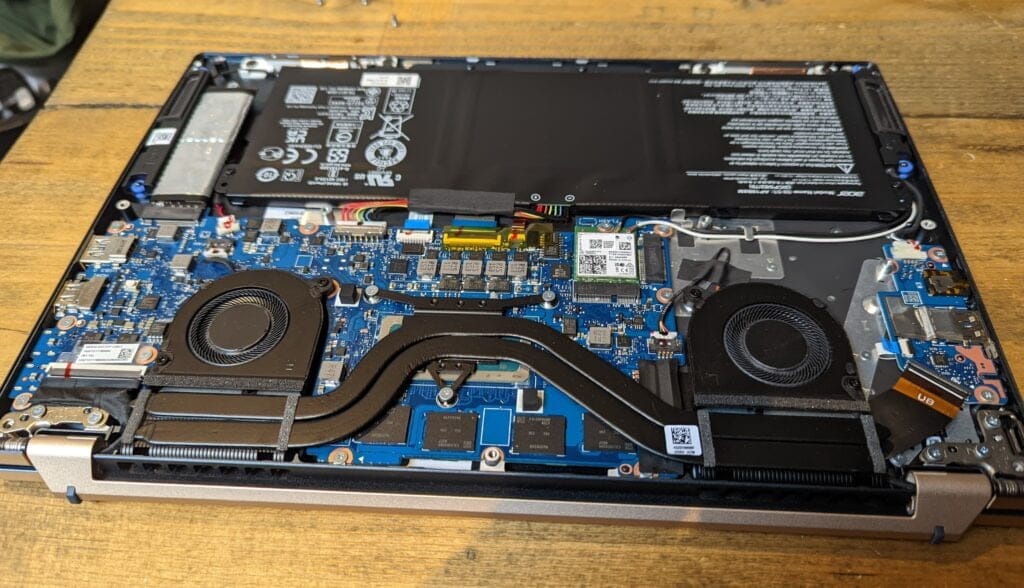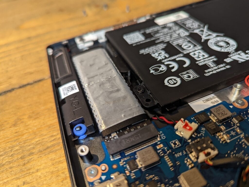 Like all other ultraportables, there are limited options for upgrades, but not the worst I have seen. The Wi-Fi module and NVMe drive are both easily accessible. The installed NVMe is incredibly fast, but it is only 475GB which I think is a bit on the low end for a laptop nowadays and certainly one at this price. Therefore it is something I would want to upgrade at some point.