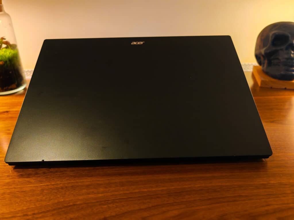 Despite its lightweight structure, the laptop has a sturdy build and a sleek design. The laptop’s chassis is coated with a colour Acer refers to as “Olivine Black”. The grainy texture of the lid gives the laptop an unusual yet pleasing tactile feel.