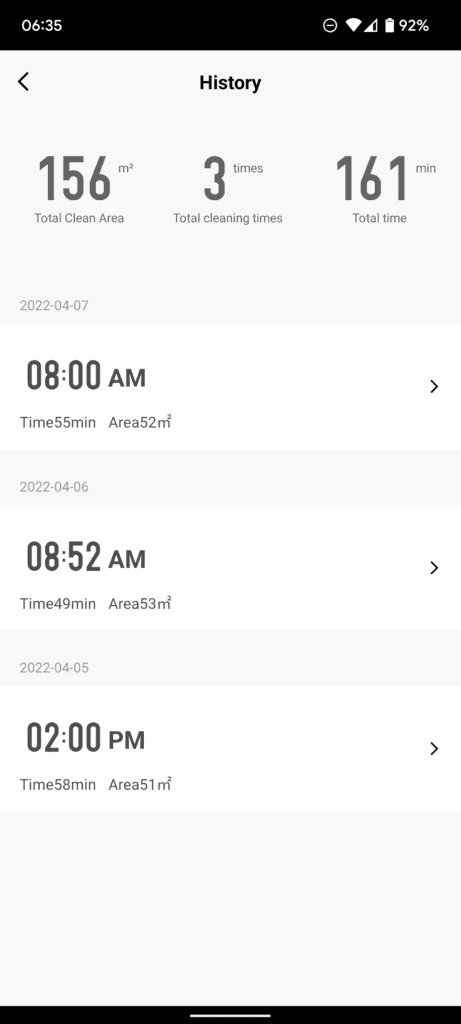 In my house, the robot consistently records around 53m3 and a run time of 50 minutes to 1 hour, which covers 4 large rooms. It is claimed the max run time is 250mins, which should cover the largest of properties.