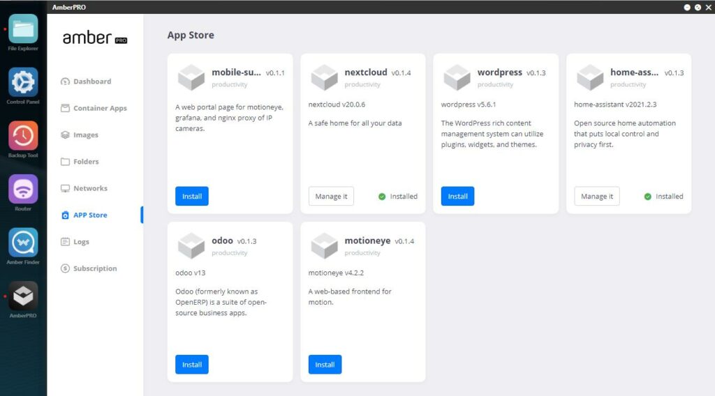 The AmberPro App Store is basically pre-configured Docker templates giving you the same sort of easy installation that Synology and TerraMaster have with their apps. I found these apps much easier to install than the app repository used by TerraMaster. You click on install, and that is it, you don’t need to configure anything. The downside is that there are just 6 of these apps.