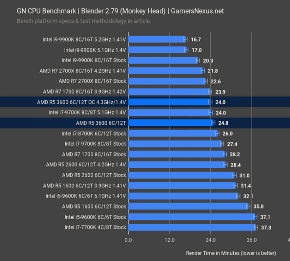 Just to make this overview less biassed towards the R5 3600, the CPU does not fair as well in the Blender 2.79 test where the application is very much core count biassed. Here the 3600 finishes around 2 mins slower than the 2700X but comfortably outperforming the 9700K and representing a 20% improvement over the R5 2600 or 30% over the 1600.