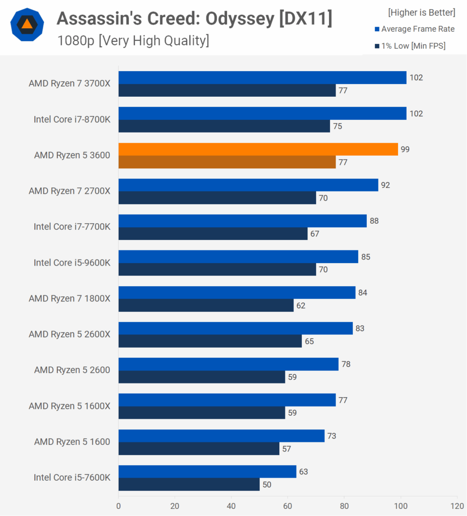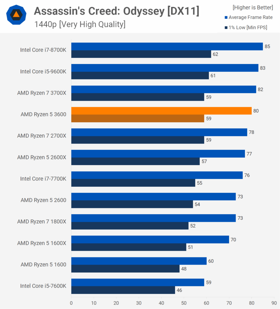 In Assassin’s Creed: Origins the R5 3600 has even more impressive results, not only does it comfortably beat the old R7 2700X but a stock R5 3600 outperforms the stock Intel i5-9600K – sadly overclocking is less successful on the AMD compared to the Intel.