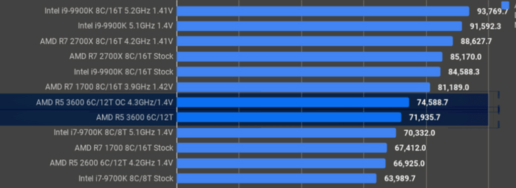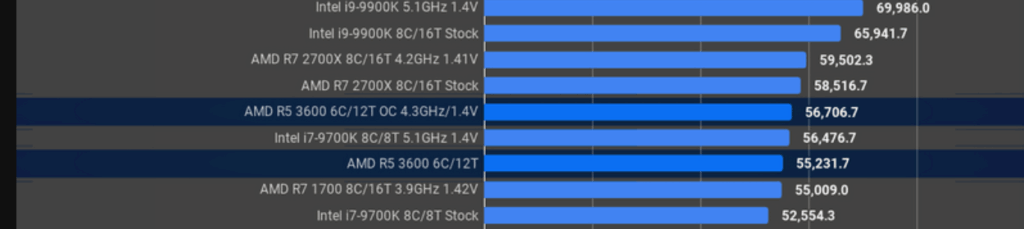 Moving onto other benchmarks they found that the R5 3600 didn’t quite beat the 2700X stock CPU for compression with 7-Zip which is likely due to it having fewer cores. However, it is very close and a 3600 at 4.3GHz all-core performs about where a 5.1GHz 9700K. It performed a little worse for the decompression but still admirably.