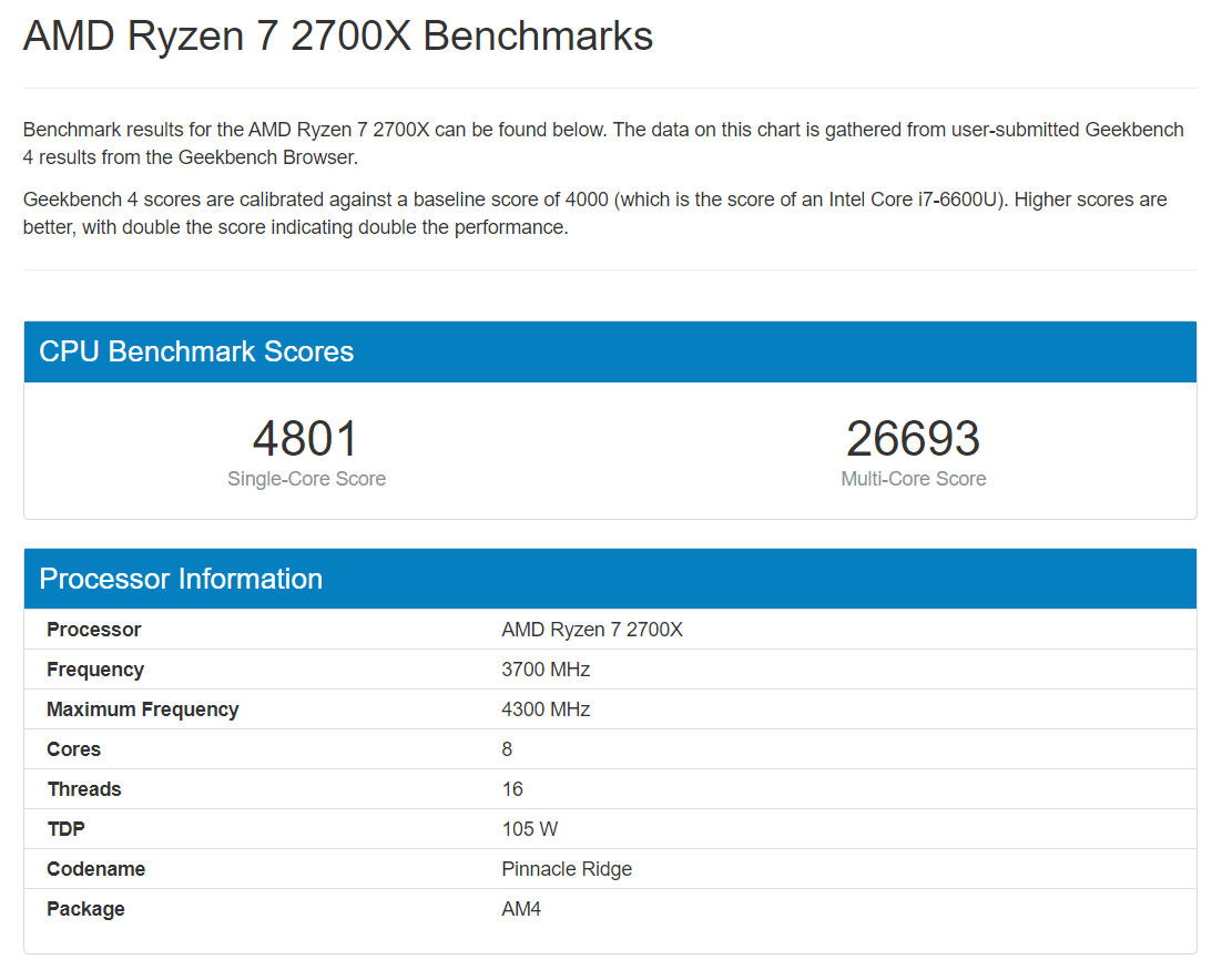 In comparison, last years Ryzen 7 2700X is listed as having 4801 on a single core and 26693 for multi-core.