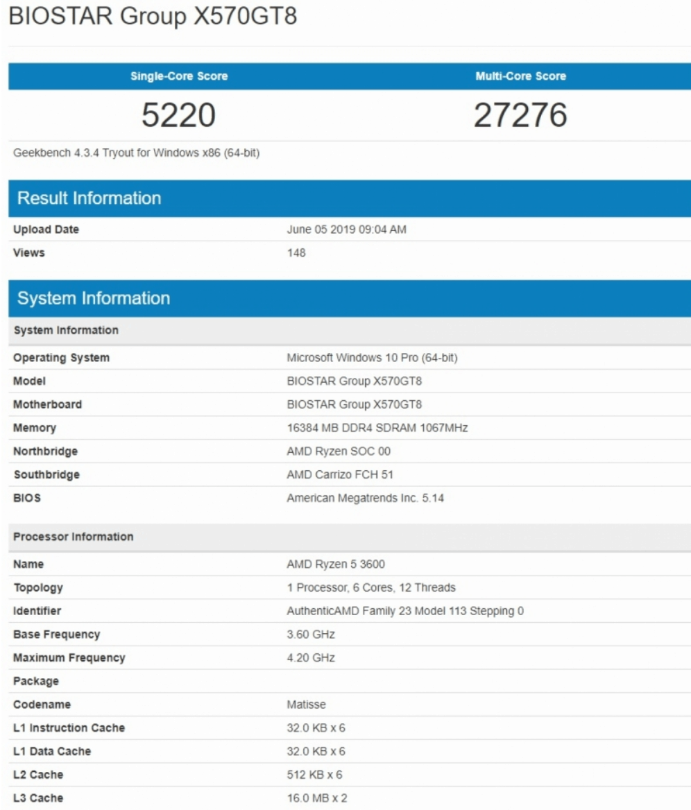 This Geekbench result comes from a PC with a BIOSTAR X570 GT8 motherboard, operating with what appears to be 2133MHz DDR4 memory and stock clock speeds, running with a base clock speed of 3.6GHz and a boost clock speed of 4.2GHz.