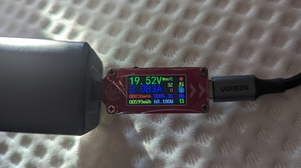 Even though I couldn’t test the single port peak power, I did charge two laptops at once. In this scenario, both laptops appeared to draw a bit over 55W consistently. Not quite 120W, but charge rates vary depending on usage, and it definitely exceeds the 100W that competing brands are capable of.
