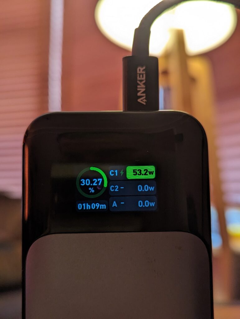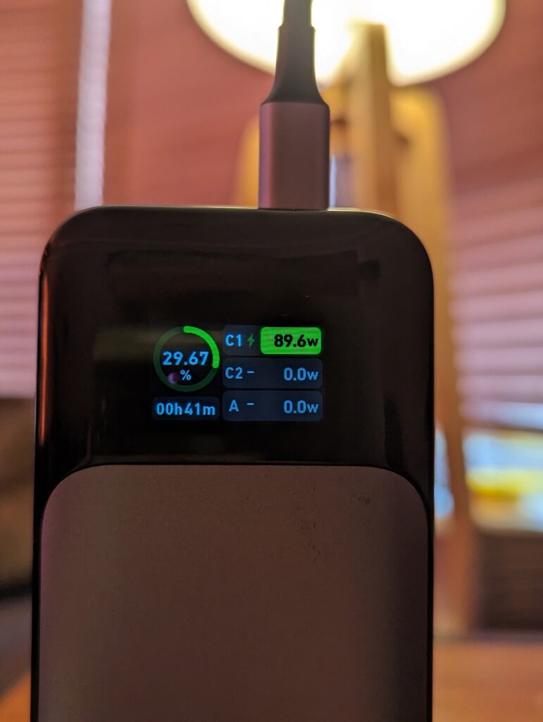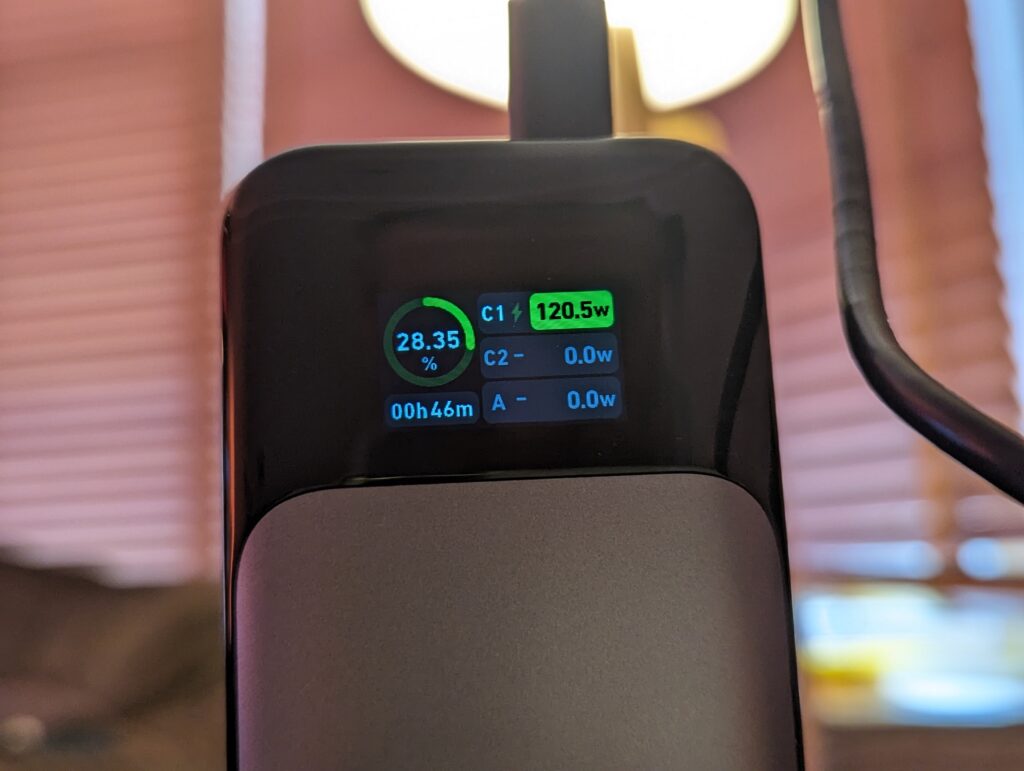 My power bank arrived with 27% charge, and when using the included 140W cable, I typically saw 120W input, though it did occasionally jump a little higher than this. So a bit short of what Anker advertises, but still incredibly fast.