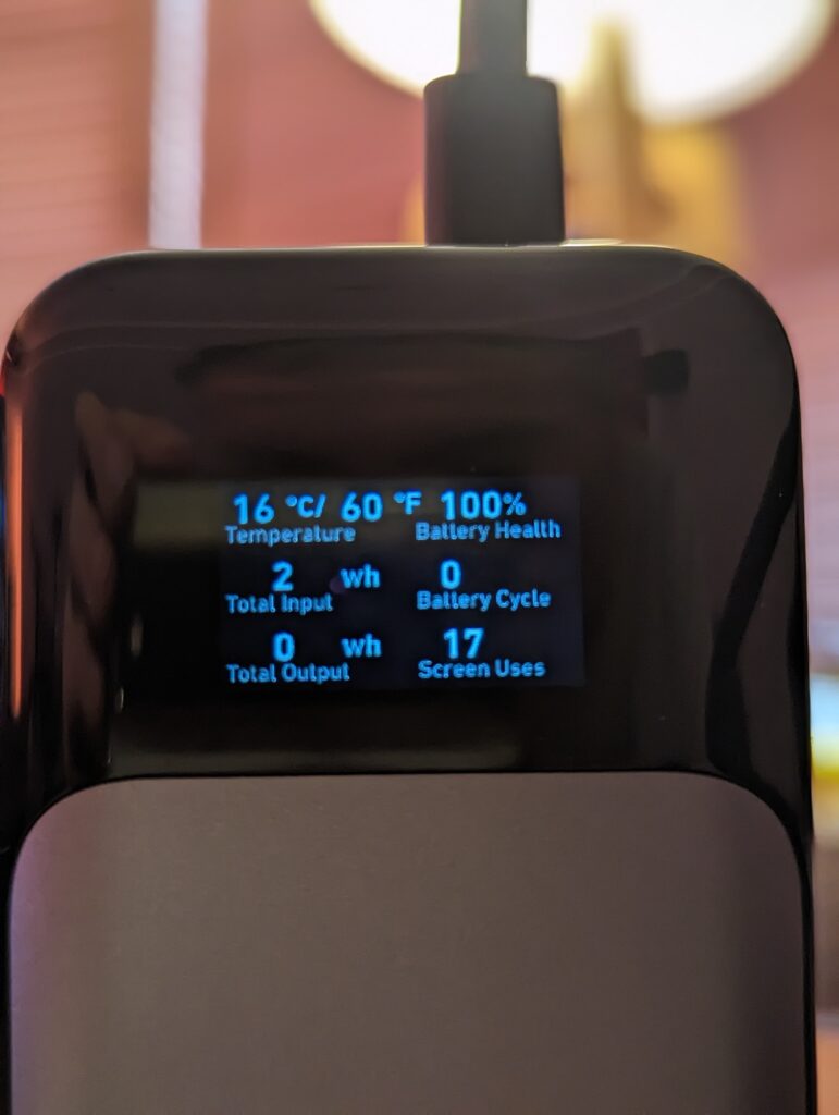 The display also shows the Wh input and output. My sample arrived with a 25% charge and charged by 70Wh, which would actually work out as 93.3Wh – In hindsight, I realised I charged my Pixel 6 a bit when I received it; hence the Wh being higher than expected.