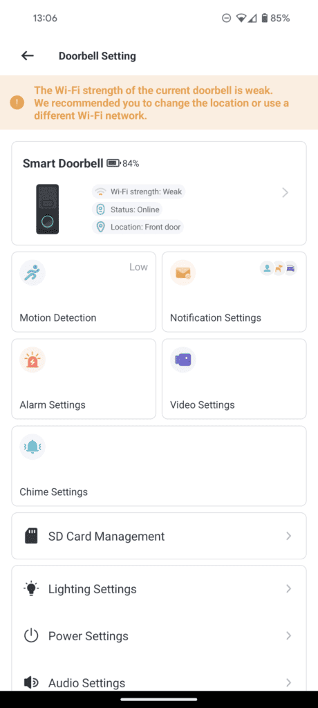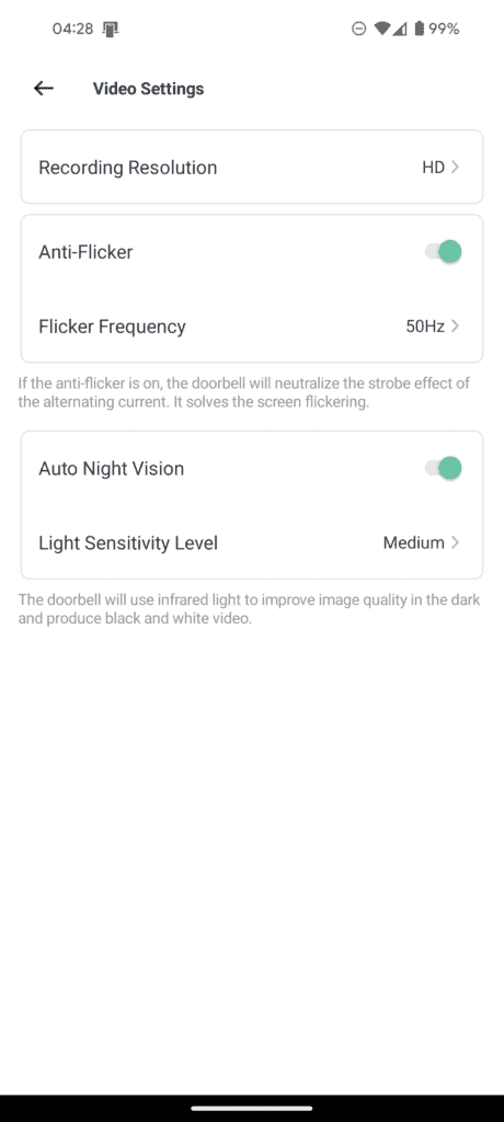 By default, the doorbell was recording in SD, likely to save battery life, so I had to switch it to HD. With the cloud recordings at least, there appears to be no way to adjust the recording length or enable any advanced features like pre-roll.