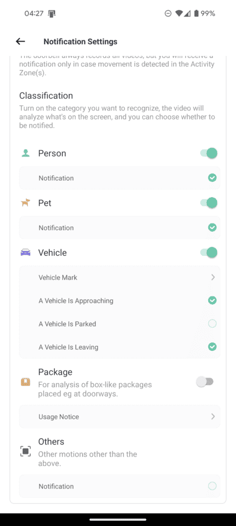 With the subscription enabled, the app has all the features you’d expect from a decent-quality video doorbell. You can customise which notifications you get, for example, reducing them to people only.