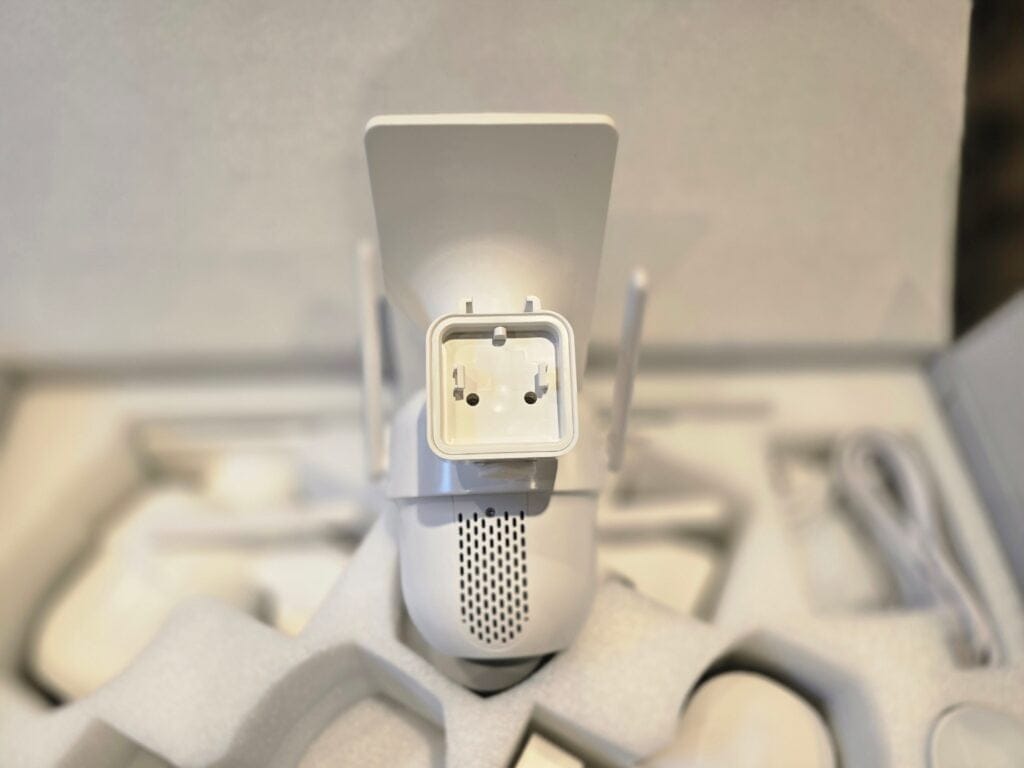The bottom of the camera houses the speaker, and the rear features the mounting area. A rubberized, weatherproof cover on the underside of the mount conceals a USB-C port, providing an option for connecting a power bank or permanent power source if needed.