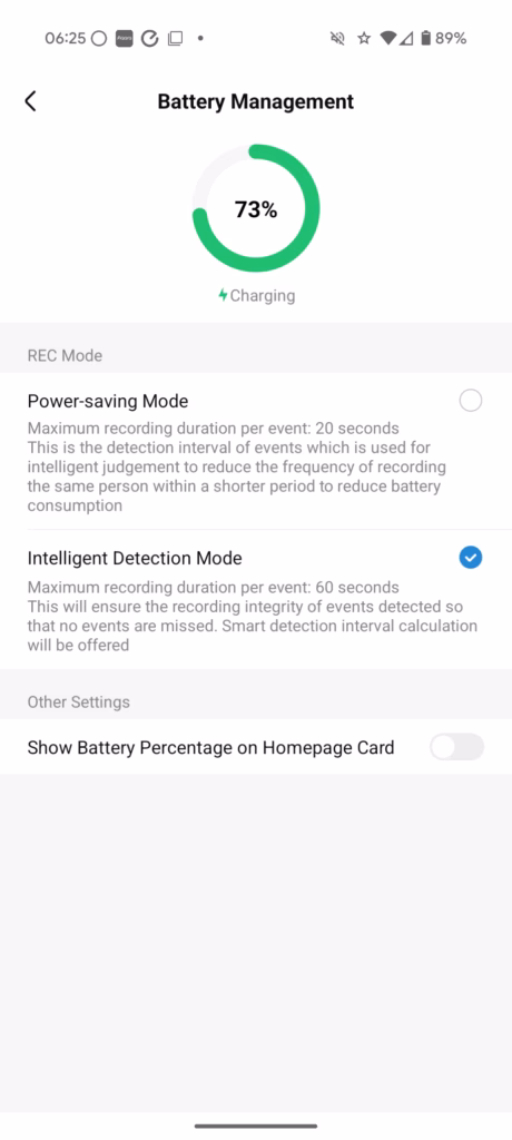 During several weeks of use, I didn’t need to charge the cameras, even in the inclement and cloudy conditions typical of British weather. It consistently stayed above 90% when I checked it.
