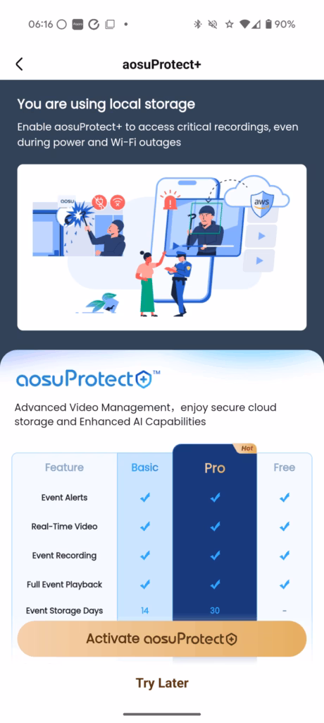 The Aosu app, available for both iOS and Android, remains stable and functional. The main dashboard gives straightforward access to live views, playback, and configuration options.