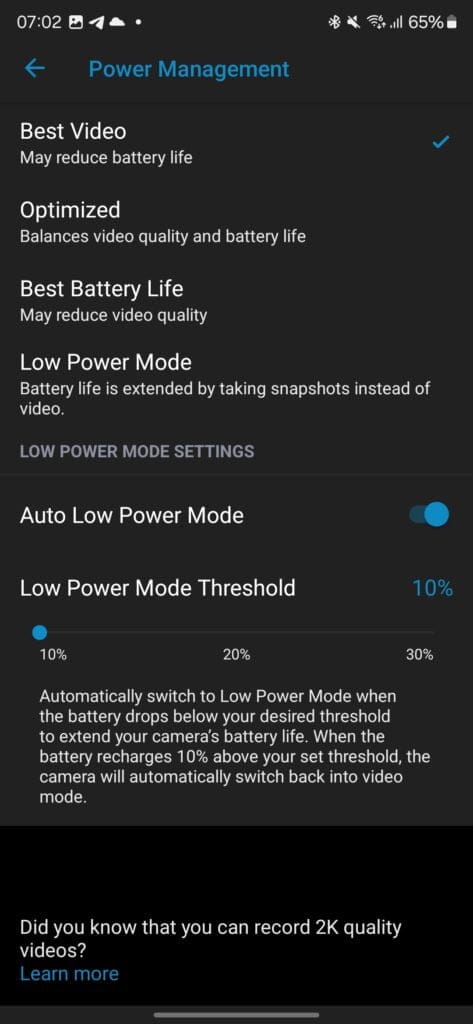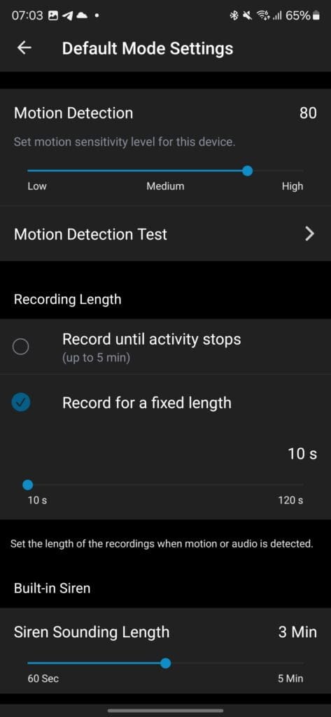 Under power management, you can tweak the settings to favour a longer battery or superior video quality and within the default mode settings, you can define the recording length to either a fixed time from 10 seconds to 120 seconds or set it until the activity stops.