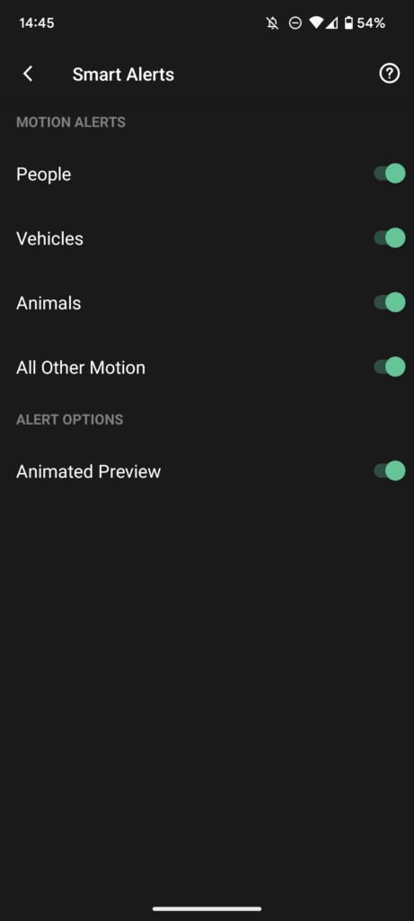 Then under smart settings, which are not within the main camera settings, you can set up the various motion alerts and animated previous. I am only interested in people, so I have just that one toggled.