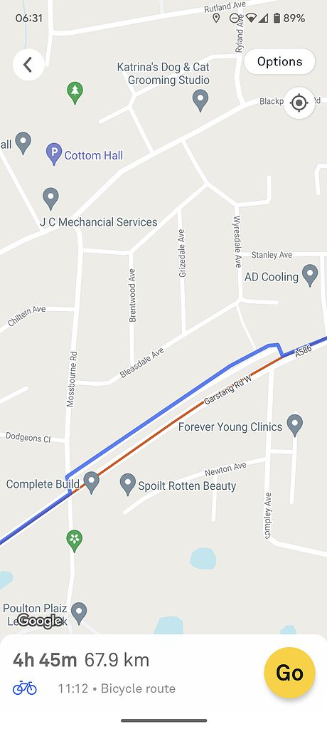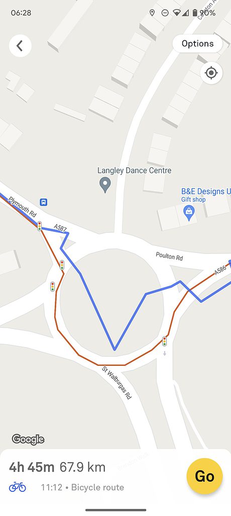 When I imported a more local route, it almost plots it perfectly. On a 68 km route, there seems to be two spots where it deviates. It seems to get confused at a roundabout and then another spot where it seems to route down an alternative road. The plotted route is down a busy road, but the Beeline plots it down a quiet road that runs parallel.