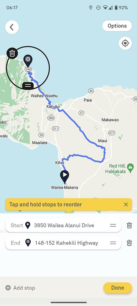 In Maui, I wanted to do the west Maui loop, which circles around Mauna Kahalawai. This should go down the Honoapiilani Highway, but no matter what I did, it refused to choose that route.