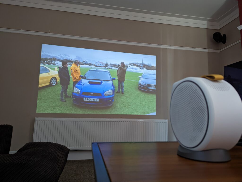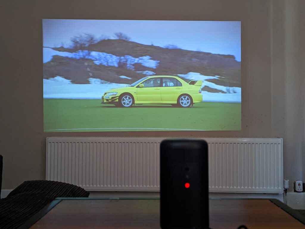 The Nebula Capsule Max is the most simple with its tubular shape. You plonk it on your table, switch it on, and that’s it. The auto focus and keystone correction mean this has been the easiest project for me to use. However, it is reliant on you having the surface at the right height for where you want to project. If you want some sort of adjustment, then you are going to have to invest in a tripod.