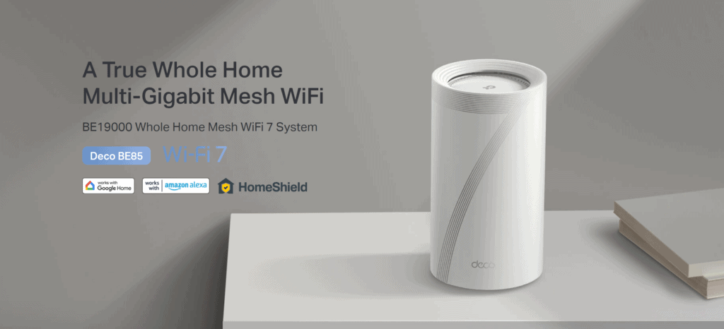 The TP-Link Deco BE85 is a powerful tri-band mesh WiFi 7 system designed to deliver blazing fast whole home coverage. It features 12-stream connectivity with speeds up to 19 Gbps, making it TP-Link’s fastest WiFi system yet. Key features include support for the new 6GHz band, 10Gbps ports for multi-gigabit internet and backhaul, and advanced technologies like 320MHz channel width, multi-link operation for reduced latency, and wireless/wired combined backhaul. With its eight high-gain antennas, quad-core CPU, and 12 high-power FEMs for extended range, the Deco BE85 can cover over 9,000 square feet with seamless roaming. It’s an excellent future-proof system for homes with gigabit fiber internet or high demand networks.