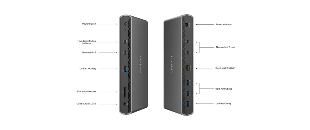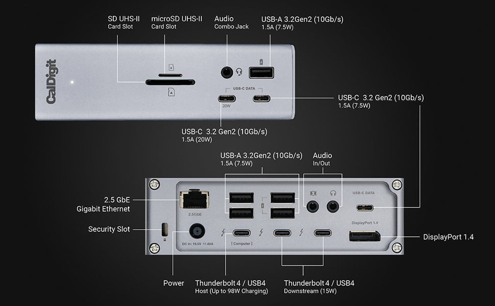 - Two downstream Thunderbolt 5 ports (80Gbps, 15W)