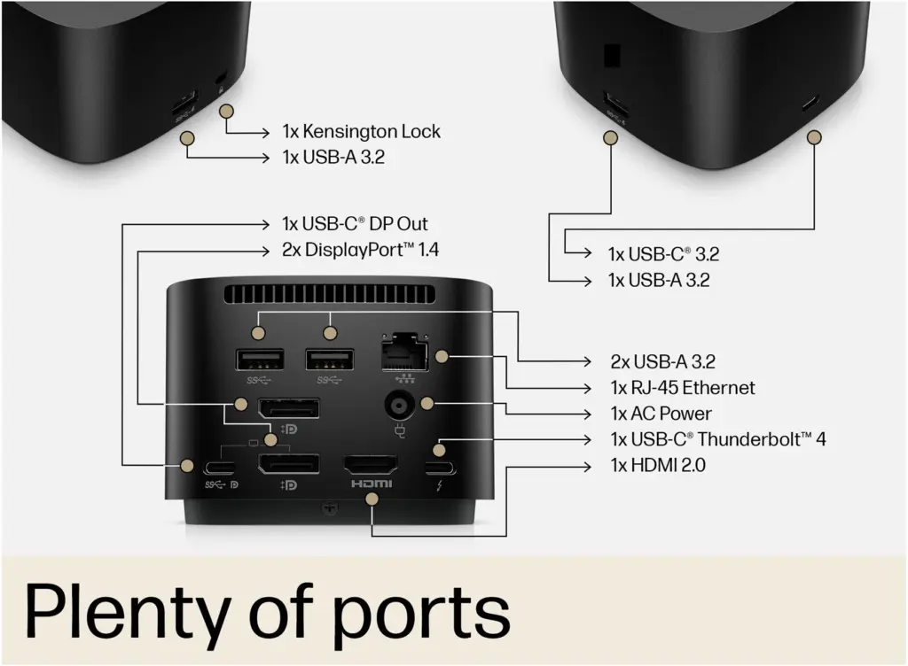 Available in two versions, the standard 120W model delivers up to 100W of power to the host laptop, while the 280W version (designed for HP workstations) can deliver up to 230W of power. The dock supports broad display options with HDMI, DisplayPort, and USB-C, making it suitable for extensive workstation setups. One drawback is the fixed (non-removable) host cable, which could be an issue if damaged.