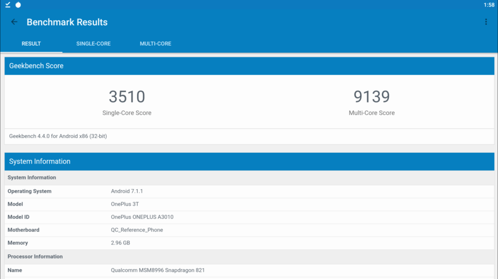 Geekbench 5 was not available in Play Store. I was able to sideload it, but it wouldn’t load up properly. I did however eventually manage to sideload and run Geekbench 4, scoring 3510/9139. The OnePlus 7 Pro will typically score around 3500/1100. So this was able to emulate single performance as well as a high-end current phone