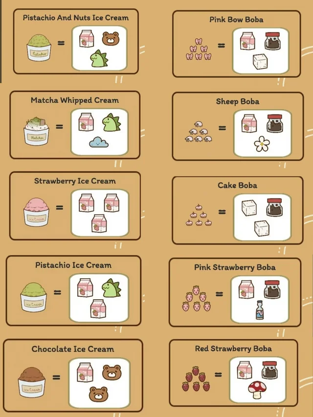 - Recipes include various types of boba, syrups, toppings, and add-ins for customising drinks in the game.