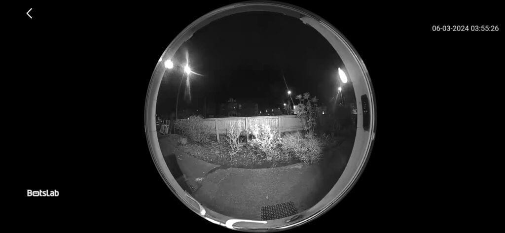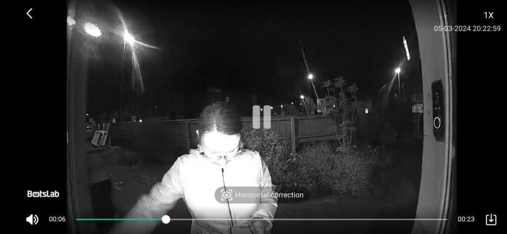 Footage in low light is acceptable. Like most doorbell cameras this will drop down to black and white in the evening using IR leds for illumination. This can cause glare and reduced quality, which exacerbates some of the issues with detail that the fisheye lens suffers from. But it works adequately for its intended purposes.