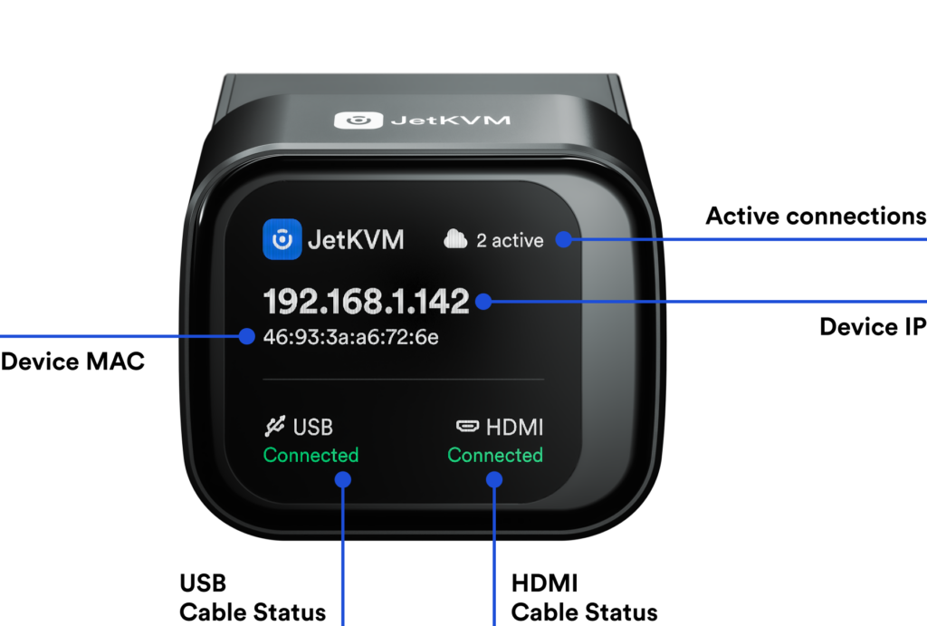 - Optional cloud access: Remote access via JetKVM Cloud using WebRTC (not mandatory)