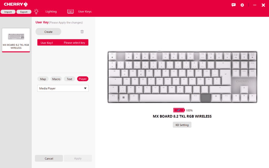 Under the user keys tab, you can map keys for various functions. You can either reassign a key to something else, create a macro, set up to 200 characters of text for the key or assign a media key function.