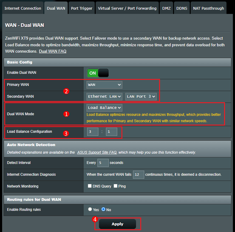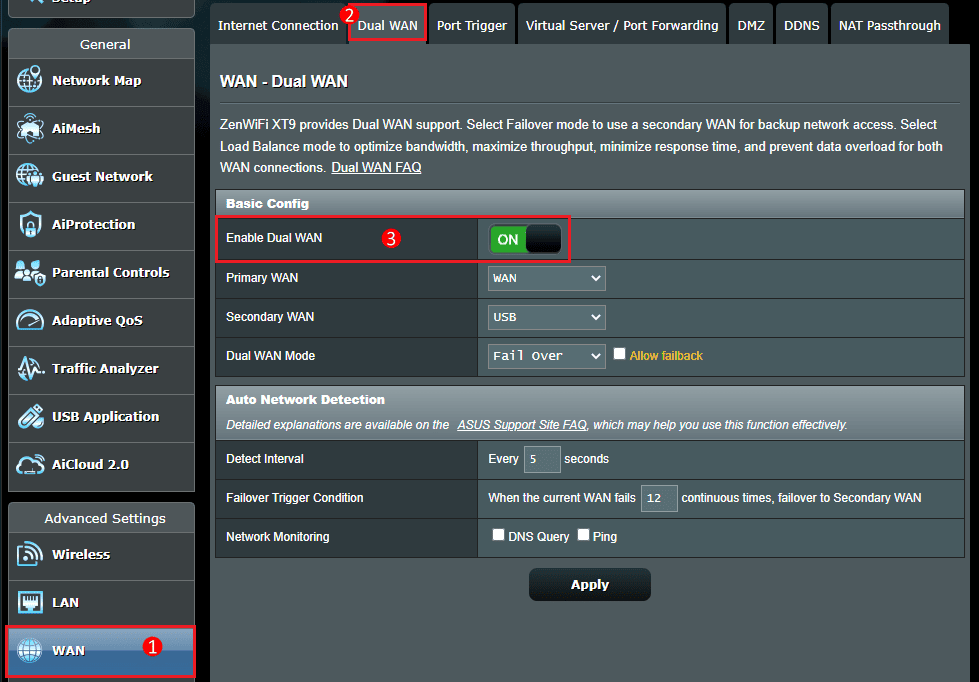 - Fallback Trigger Condition: This is the amount of times the primary WAN is available before the router switches back to it. To know the amount of time the router uses the secondary WAN before going back to the primary WAN, multiply this by the Detect Interval.