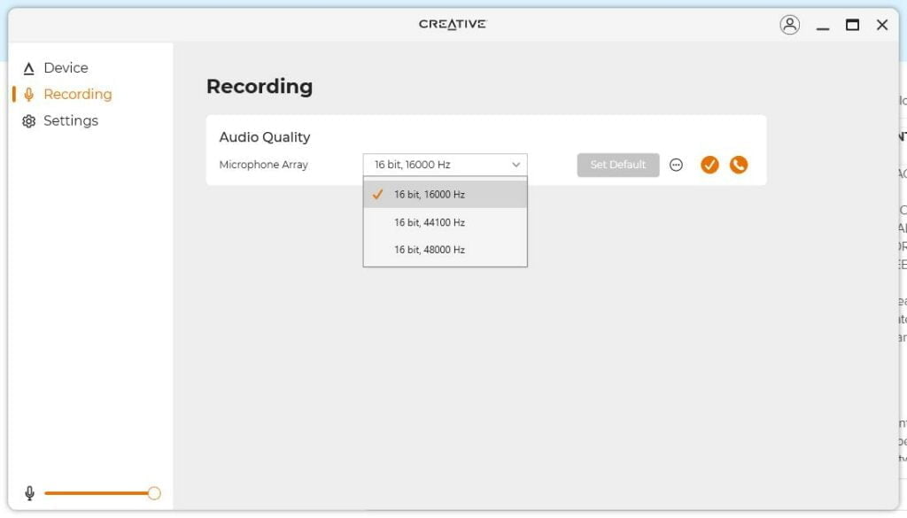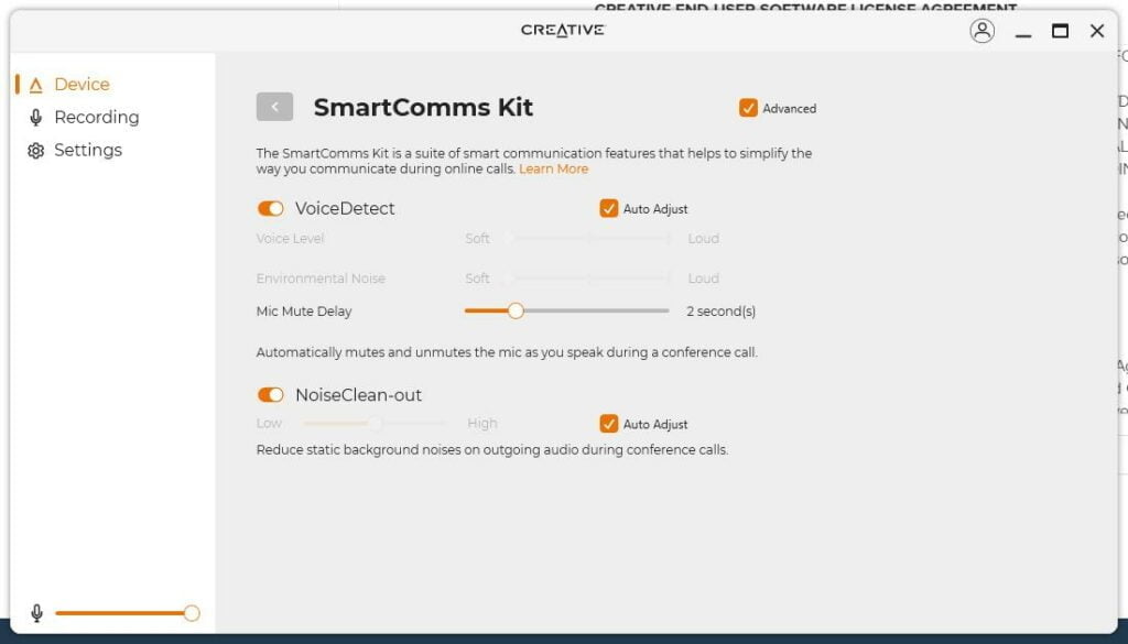 The camera uses the Creative App, which has the Smartcomms kit built-in. Using the app, you have various controls over the mic as well as enabling the different features of Smartcomms