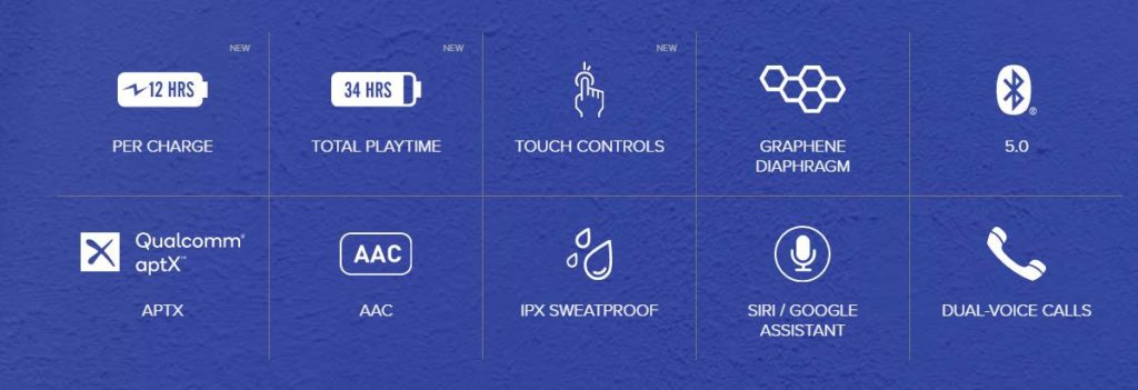 All the earphones have IPX5 ratings making them suitable for exercise and rain. They all support aptX, AAC, SBC, and use Bluetooth 5.0.