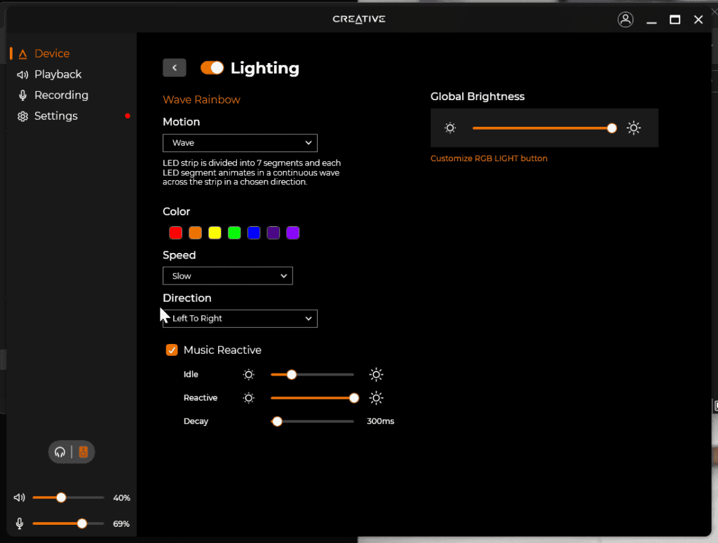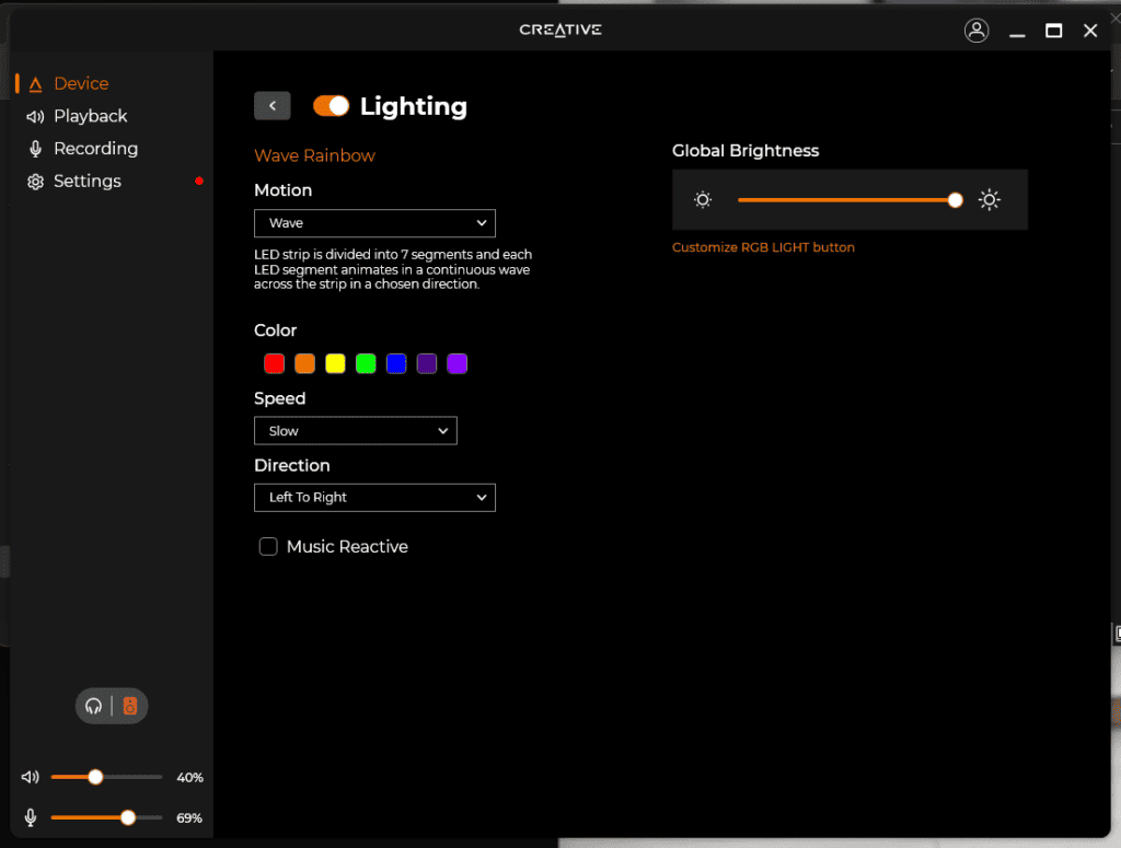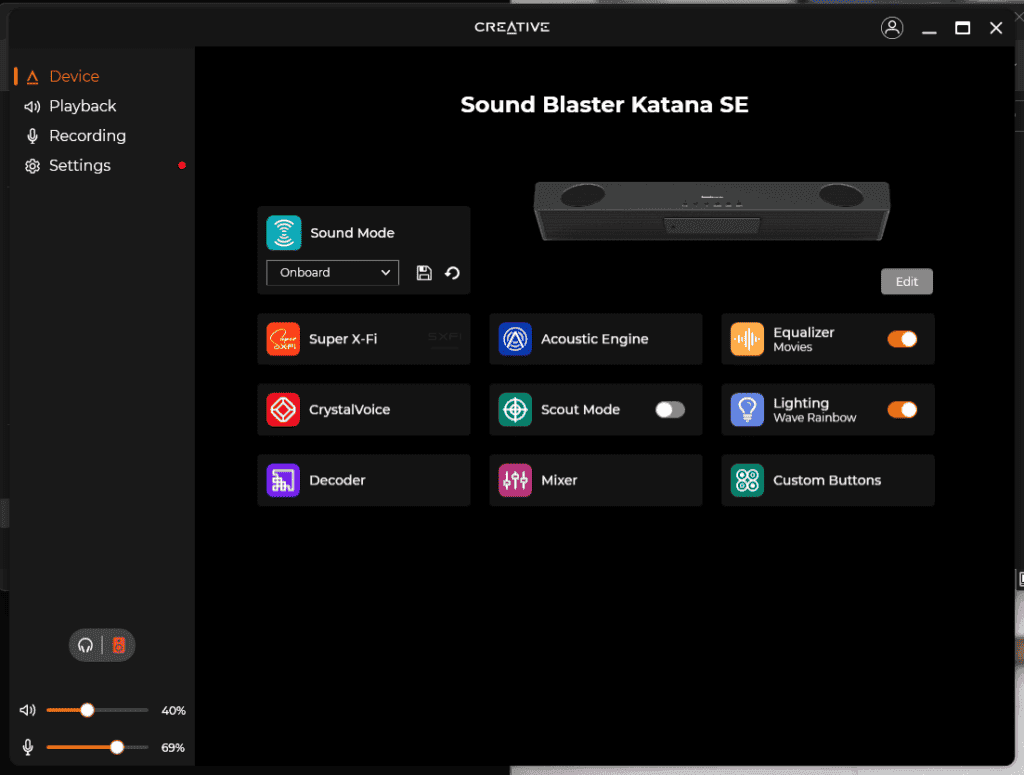 The Creative app enhances the usability of the Katana SE by providing a user-friendly interface to customise sound profiles. With the app, tweaking the EQ settings or selecting different sound modes is a breeze. It also allows for easy management of the RGB lighting to match your mood or decor.