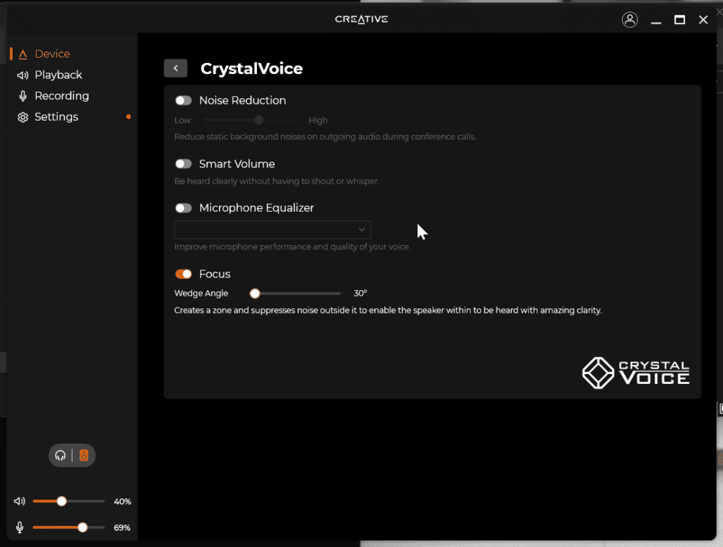 The Creative App makes a big difference. I have previously praised the CrystalVoice features in previous reviews, and it continues to work well here.