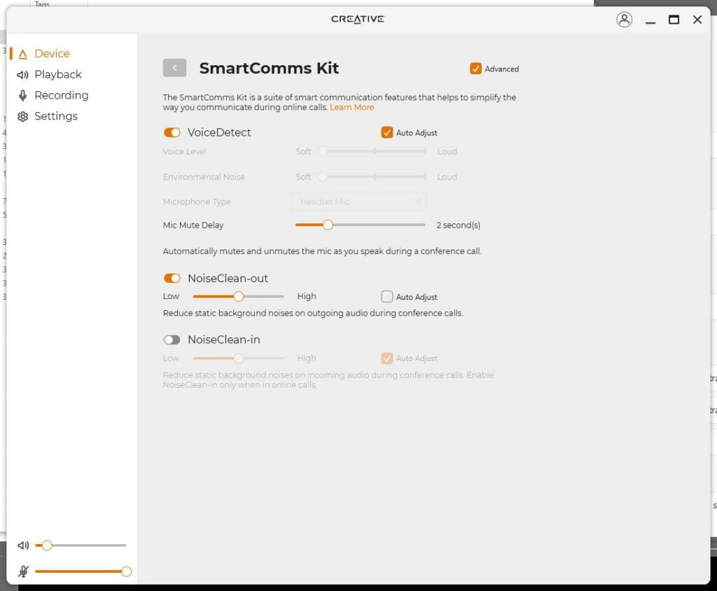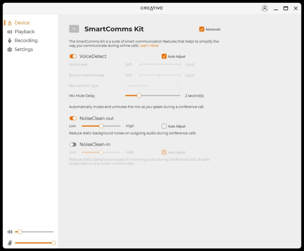 The SmartComms Kit is then the main feature Creative are advertising, enabling VoiceDetect for auto muting. NoiseClear reduces annoying background noises, and NoiseClean in reduces the background noise from other people on your call.