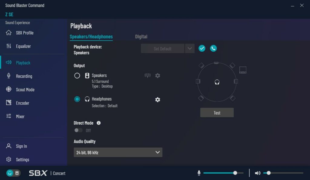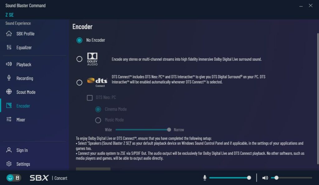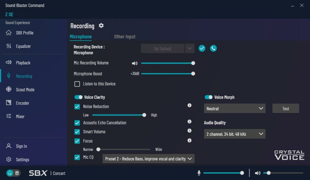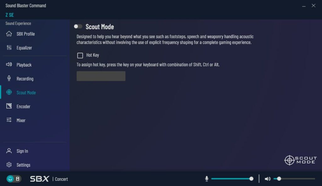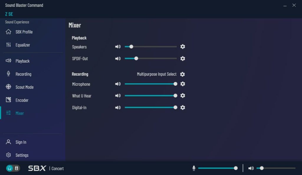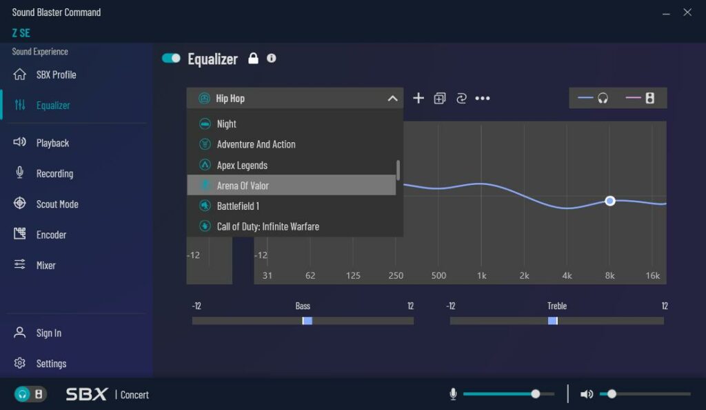 Sound Blaster Control offers a significant number of customisations, including the SBX profile, an equaliser with presets, settings for the playback device, scout mode for gaming, encoding options and a mixer for playback and recording.