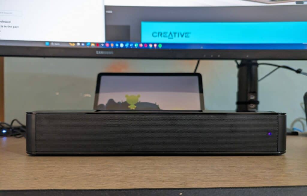 The Creative Stage SE is designed with a sleek, all-black finish that fits seamlessly into any desktop setup. The soundbar measures 41cm wide, 7cm tall and 11cm deep, making it low enough to fit under most monitors. The 41cm width also means it doesn’t take up too much desk space, it is barely wider than my keyboard.