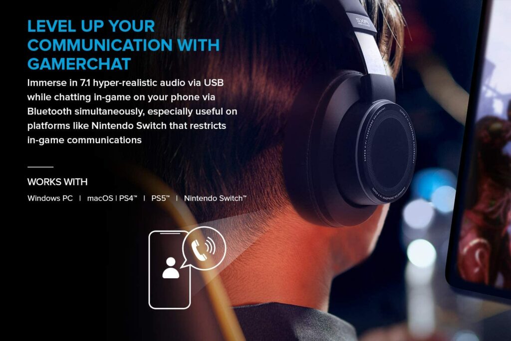 One of the main selling points of these headphones is the unique GamerChat. This allows a dual connection with Bluetooth on your phone then USB on your PC/console. With this connectivity, you can seamlessly chat via your phone while hearing your gaming audio. This can be either to take calls mid-game, or you can create your own ad-hoc in-game chat for games that don’t have it built-in.